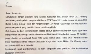 FAKTABUNGO.COM – Asosiasi Kabupaten (Askab) PSSI Bungo mengeluarkan surat edaran pendataan pelatih yang berlisensi.