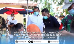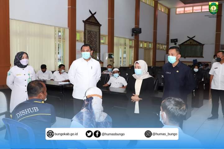 FAKTABUNGO.COM – Bupati Bungo H.Mashuri.,SP, yang didampingi oleh wakil Bupati Bungo H.Safrudin Dwi Aprianto.,S.Pd bersama unsur Forkopimda meninjau proses vaksinasi massal di  Ruang Pola Kantor Bupati, Rabu (29/06/2021)