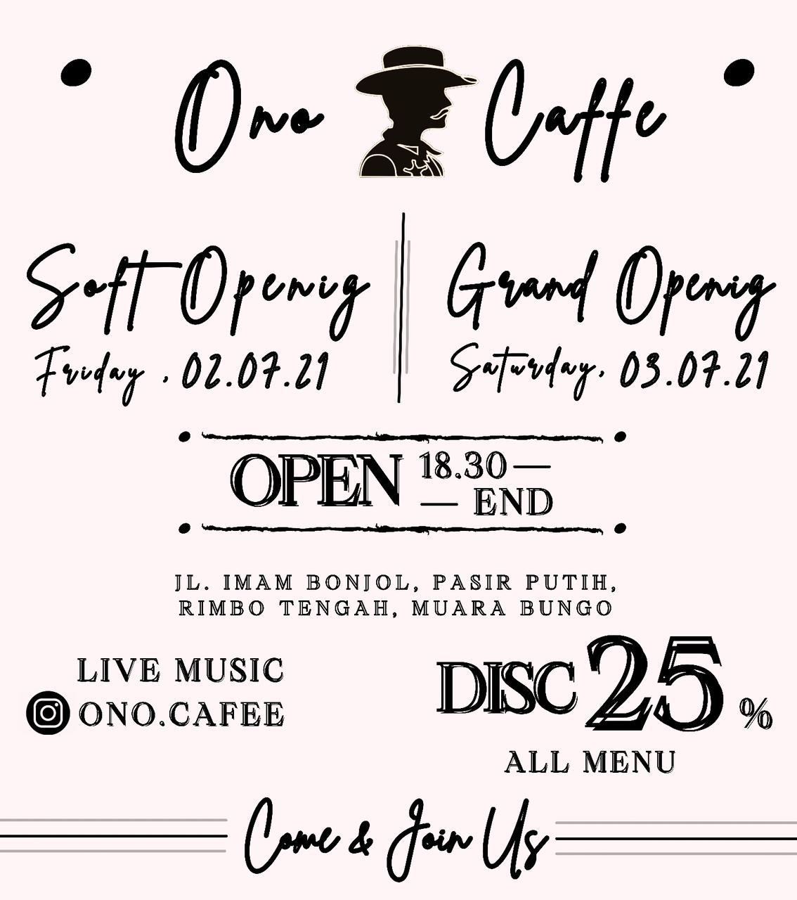 Acara Grand Opening Ono Caffe Cowboy berlangsung secara eksklusif dan penuh dengan musik acoustic, karena dihadiri tamu undangan dari berbagai kalangan dari para awak media, ormas, klub motor maupun yang lainnya.