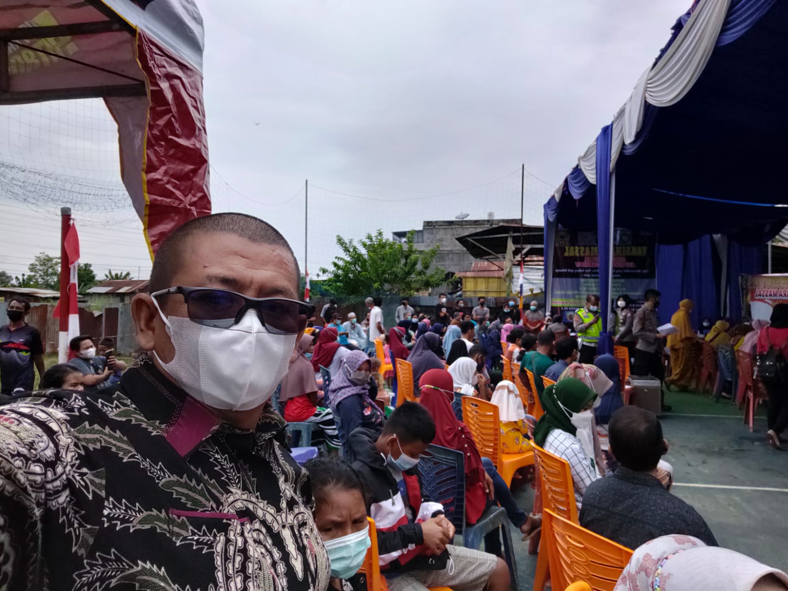 Walaupun sempat panik sebelum vaksin ini di mulai di karenakan hujan gerimis takutnya masyarakat tidak bisa datang, Alhamdulillah walaupun hujan masyarakat Dusun Sungai Mengkuang ini sangat antusias sekali untuk mengikuti vaksin massal ini.