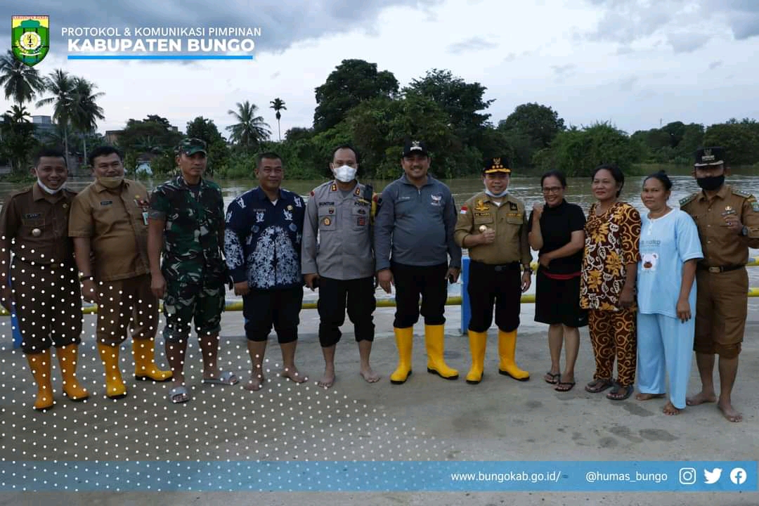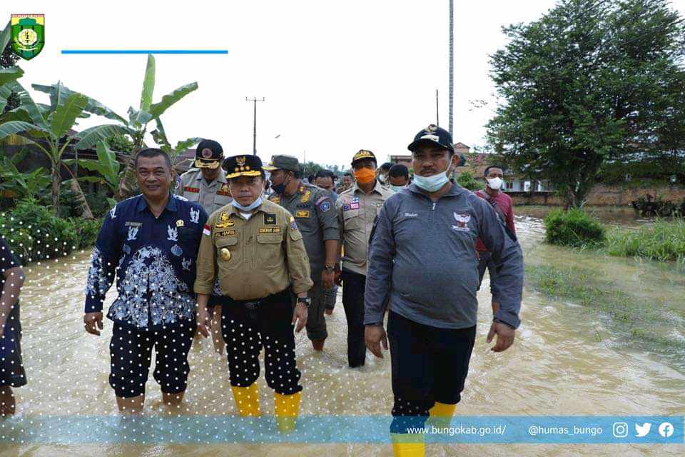 FAKTA BUNGO – Tinjau banjir ke Kabupaten Bungo Gubernur Jambi Al Haris.,S.Sos.,MH bersama Forum komunikasi provinsi didampingi oleh Bupati Bungo H.Mashuri bersama unsur forum komunikasi daerah Kabupaten Bungo meninjau korban banjir di Kabupaten Bungo, Senin (03/01/2022).
