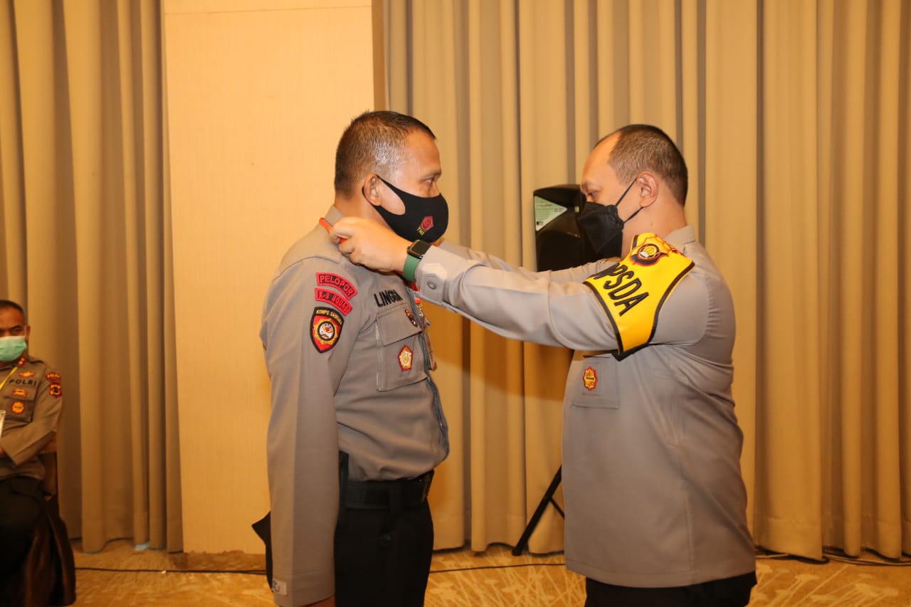 Usai menyampaikan kata sambutan, Kapolda Jambi melakukan penyematan tanda peserta kepada perwakilan peserta Rakernis.