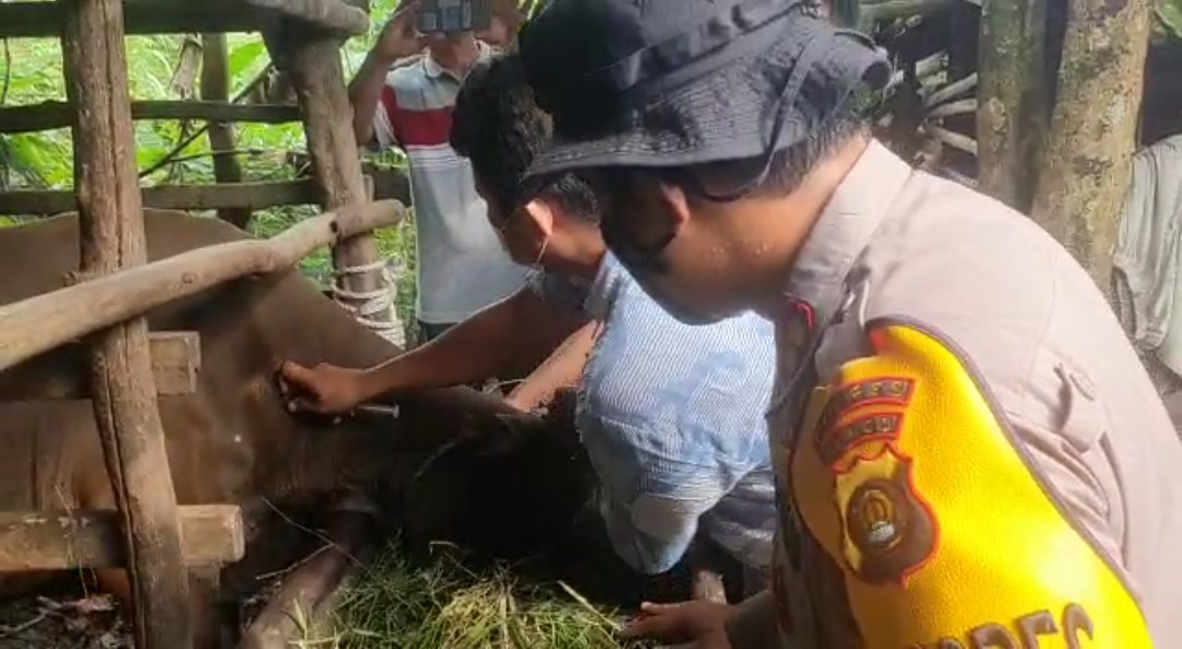 FAKTA BUNGO – Kepolisian Resor Bungo bersama Dinas Peternakan memberikan suntikan vitamin kepada Hewan ternak di Wilayah Hukum Polres Bungo, Senin (16/5/22).