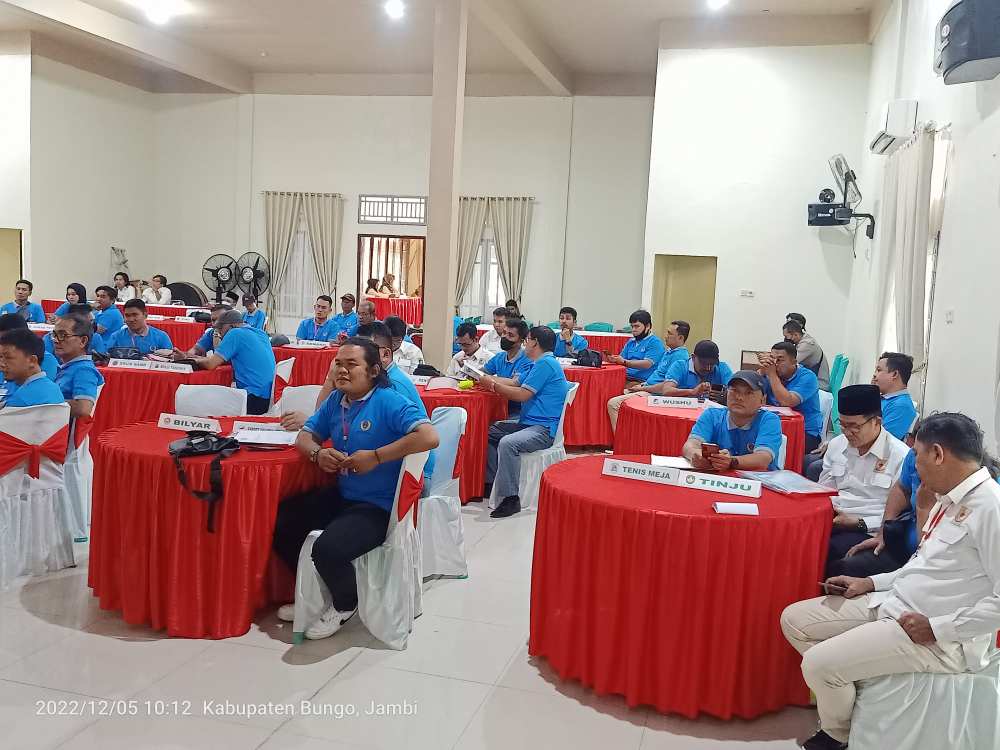 FAKTA BUNGO – Komite olahraga Nasional indonesia (KONI) Kabupaten Bungo menggelar rapat kerja Kabupaten (Rakerkab). Rakercab tersebut berlangsung di aula gedung IBI Kabupaten Bungo, Senin (05/12/2022).