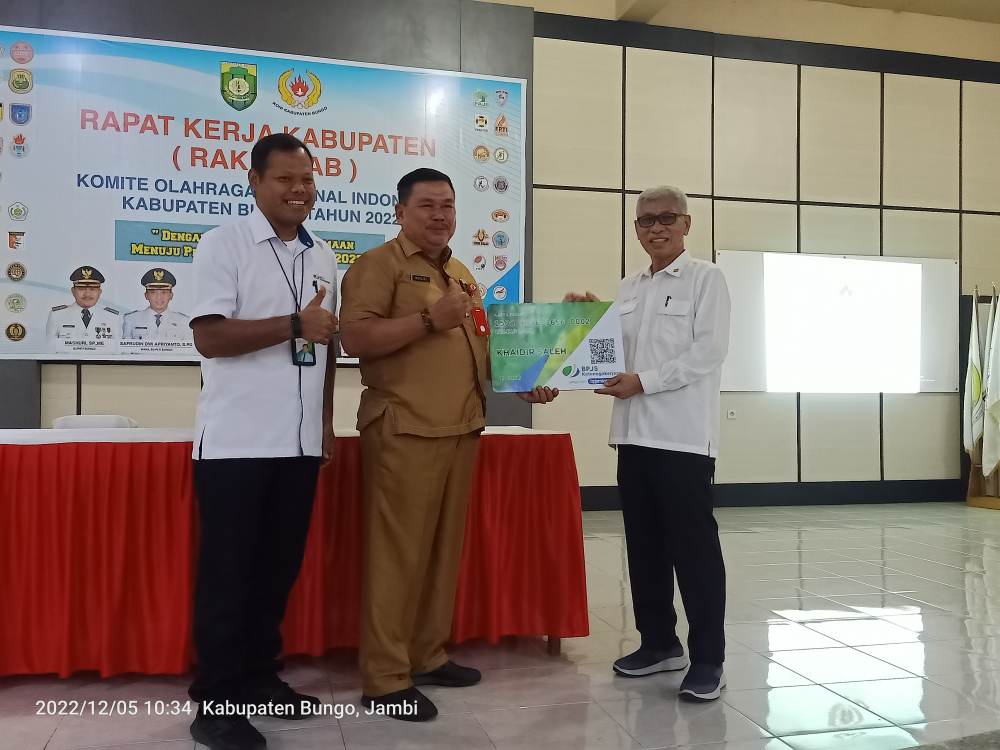 Dalam pelaksanaan Rakerkab KONI Kabupaten Bungo ini BPJS ketenagakerjaan Kabupaten Bungo memberikan secara simbolis kartu peserta BPJS ketenagakerjaan yang di terima langsung oleh ketua KONI Bungo Khaidir saleh, dan di lanjutkan dengan pemberian kartu peserta BPJS ketenagakerjaan kepada seluruh atlet.(FB)