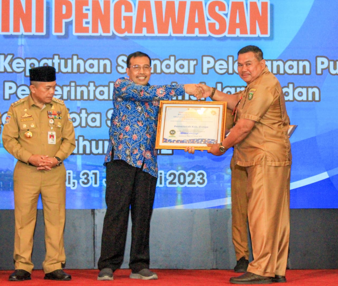 Terkait penghargaan Predikat Kepatuhan Standar Pelayanan Publik Tahun 2022 dari Ombudsman RI, Pemkab Bungo berhasil meraih nilai 80,41 sehingga meraih Zona Hijau dengan opini Kualitas Tinggi.
