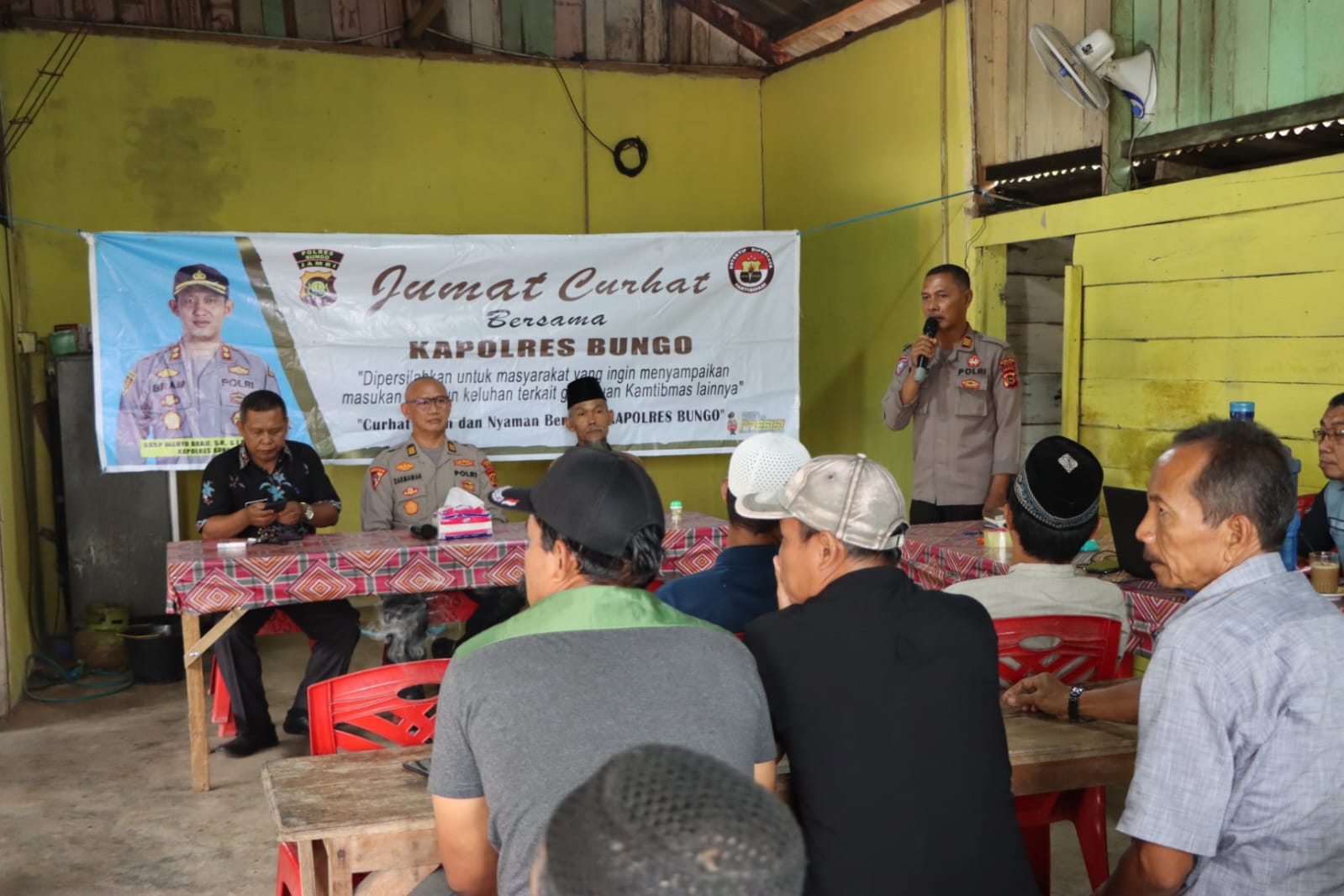 Pada sambutannya “Program Jumat Curhat merupakan salah satu upaya pembinaan kemitraan Polres Bungo dan Polsek Jajaran dengan masyarakat, dimana Polri dapat berinteraksi secara langsung dengan masyarakat untuk mendengarkan saran, kritikan, masukan serta aduan masyarakat terkait dengan pelayanan kepolisian”, “Intinya kami sangat membutuhkan saran, kritik, dan informasi masyarakat. Hal ini sebagai bahan evaluasi kami dalam rangka membenahi, memperbaiki ataupun meningkatkan kualitas kinerja pelayanan,” Ujarnya.