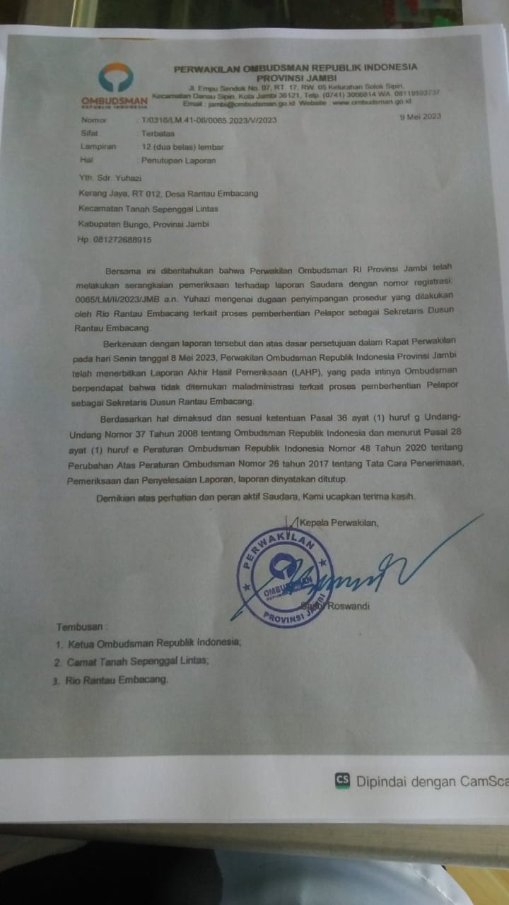 Berkenaan dengan laporan tersebut dan atas dasar persetujuan dalam rapat perwakilan hari Senin tanggal 08 Mei 2023, perwakilan Ombudsman RI Perwakilan Provinsi Jambi telah menerbitkan laporan akhir hasil pemeriksaan (LAHP), pihak ombudsman berpendapat bahwa tidak di temukan maladministrasi terkait proses pemberhentian yuhazi sebagai sekretaris Dusun Rantau Embacang.