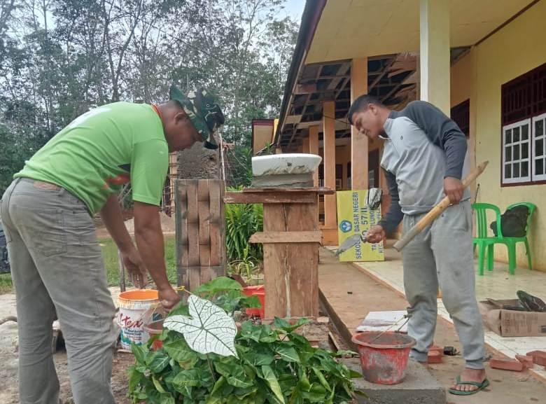 FAKTA BUNGO – Guna mendukung program pola hidup sehat untuk siswa SD Negeri 57/II Talang Silungko, Satgas TMMD Ke-117 Kodim 0416/Bute membuat tempat cuci tangan di depan Sekolah, Senin (17/07/2023).