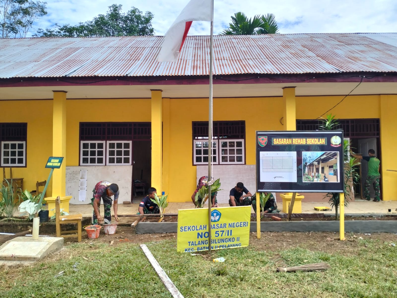 Danramil 416-04/Pulau Temiang Kapten Inf Wakhid Nurokhim selaku koordinator rehab SD Negeri 57/II Talang Silungko menyampaikan saat ini Satgas TMMD melaksanakan pembuatan taman untuk SD Negeri 57/II Talang Silungko.