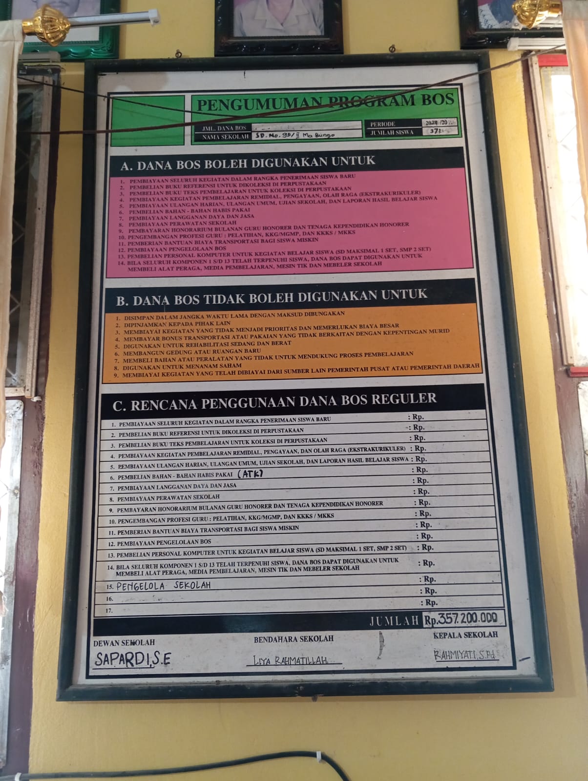 Terlihat ada beberapa program Dana Bos yang tertera di papan informasi SDN 95 tersebut,