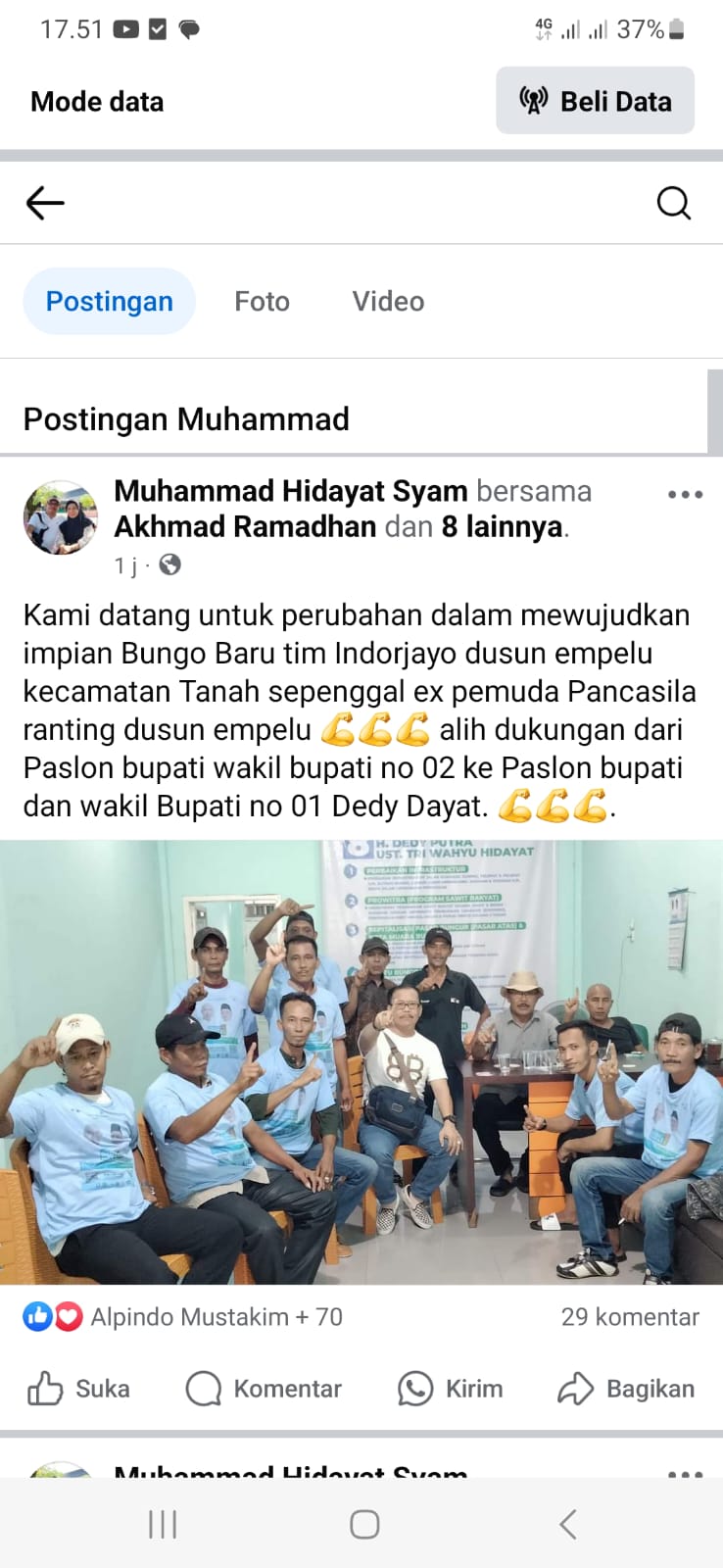 Rizki menyebutkan bahwa postingan Muhammad Hidayat Syam direktur pemenangan tim calon Bupati Dedy – Dayat pada laman media sosial facebook miliknya tidaklah benar.