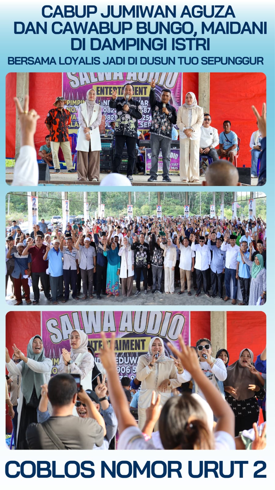 FAKTA BUNGO – Ribuan masyarakat dusun Tuo Sepunggur kompak dukung calon Bupati dan Wakil Bupati Jumiwan Aguza, S.M., M.M – Maidani, S.E untuk jadi Bupati Bungo.