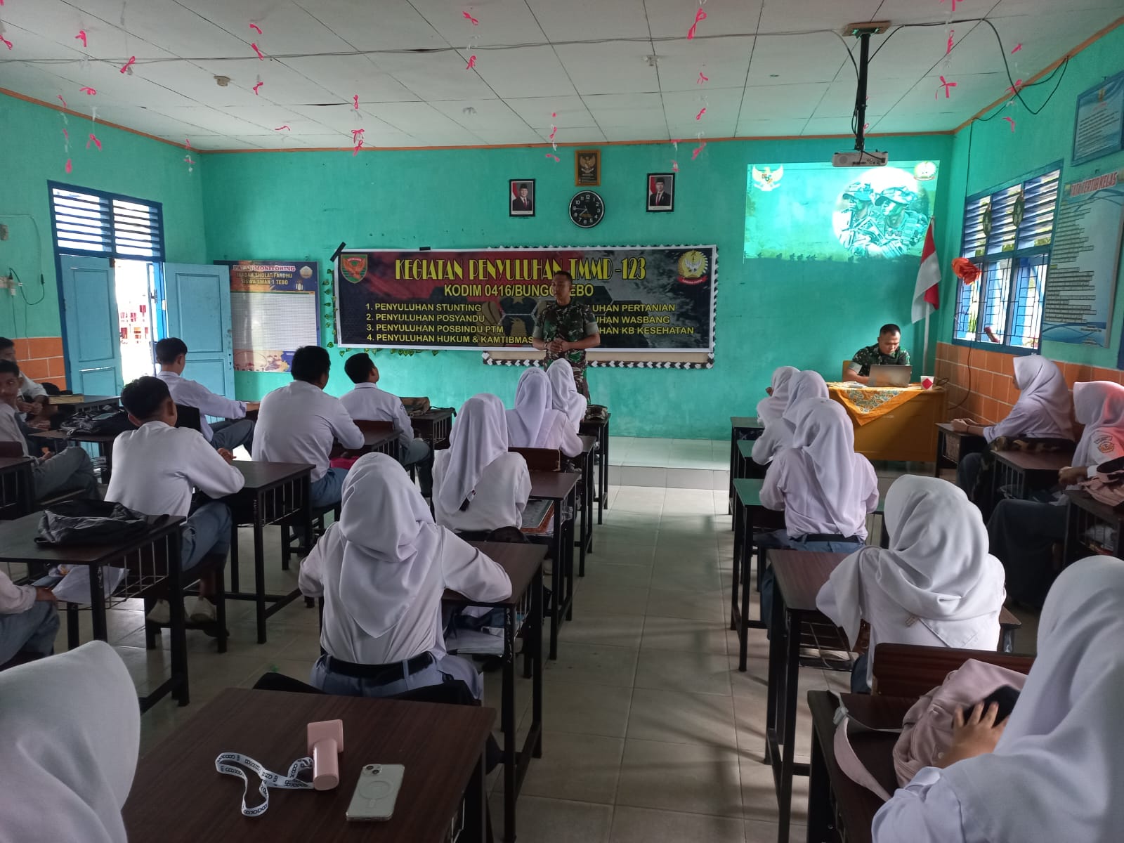 FAKTA TEBO – Satuan Tugas (Satgas) TNI Manunggal Membangun Desa (TMMD) Ke-123 Kodim 0416/Bute melaksanakan kegiatan non-fisik dengan memberikan penyuluhan Wawasan Kebangsaan (Wasbang) kepada siswa-siswi SMA Negeri 1 Tebo di Desa Teluk Kuali, Kecamatan Tebo Ulu, Kabupaten Tebo, Kamis (27/02/2025).