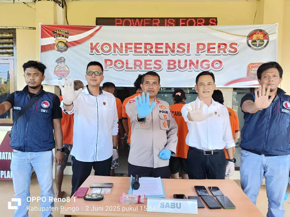 Kapolres Bungo AKBP Natalena Eko Cahyono didampingi Oleh Kasat Narkoba Riko mengatakan, pada hari kamis tanggal 29 Mei 2025 sekitar pukul 20.00 WIB, Satres Narkoba Polres Bungo berhasil mengamankan 3 orang tindak pidana penyalahgunaan narkotika jenis sabu di Danau Buluh, Kecamatan Pasar Muara Bungo, Kabupaten Bungo.