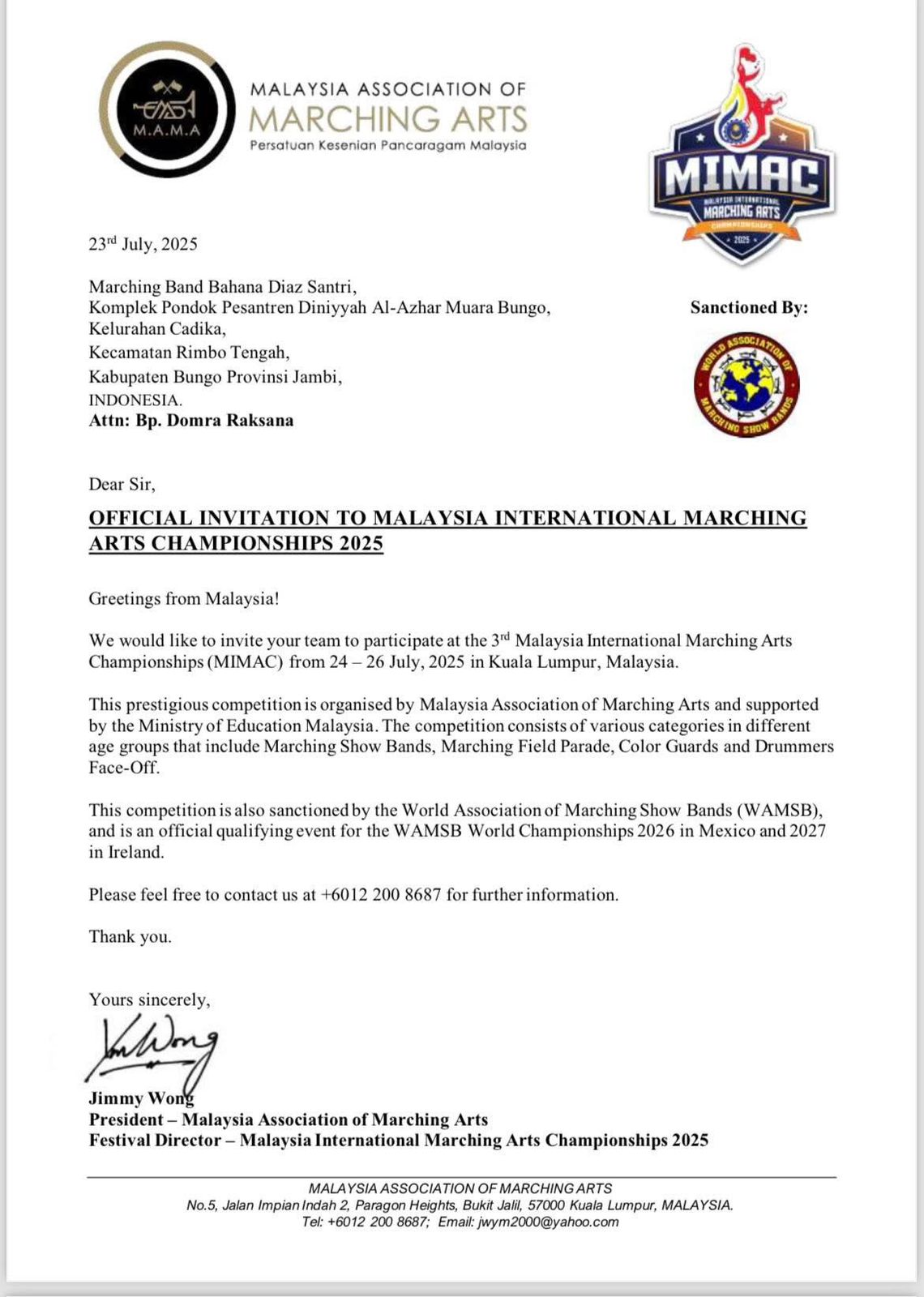 Presiden M.A.M.A yang juga menjabat sebagai Direktur Festival MIMAC 2025, Jimmy Wong, dalam surat undangannya menyampaikan apresiasi dan undangan resmi kepada Marching Band Bahana Diaz Santri untuk ambil bagian dalam perhelatan internasional tersebut.