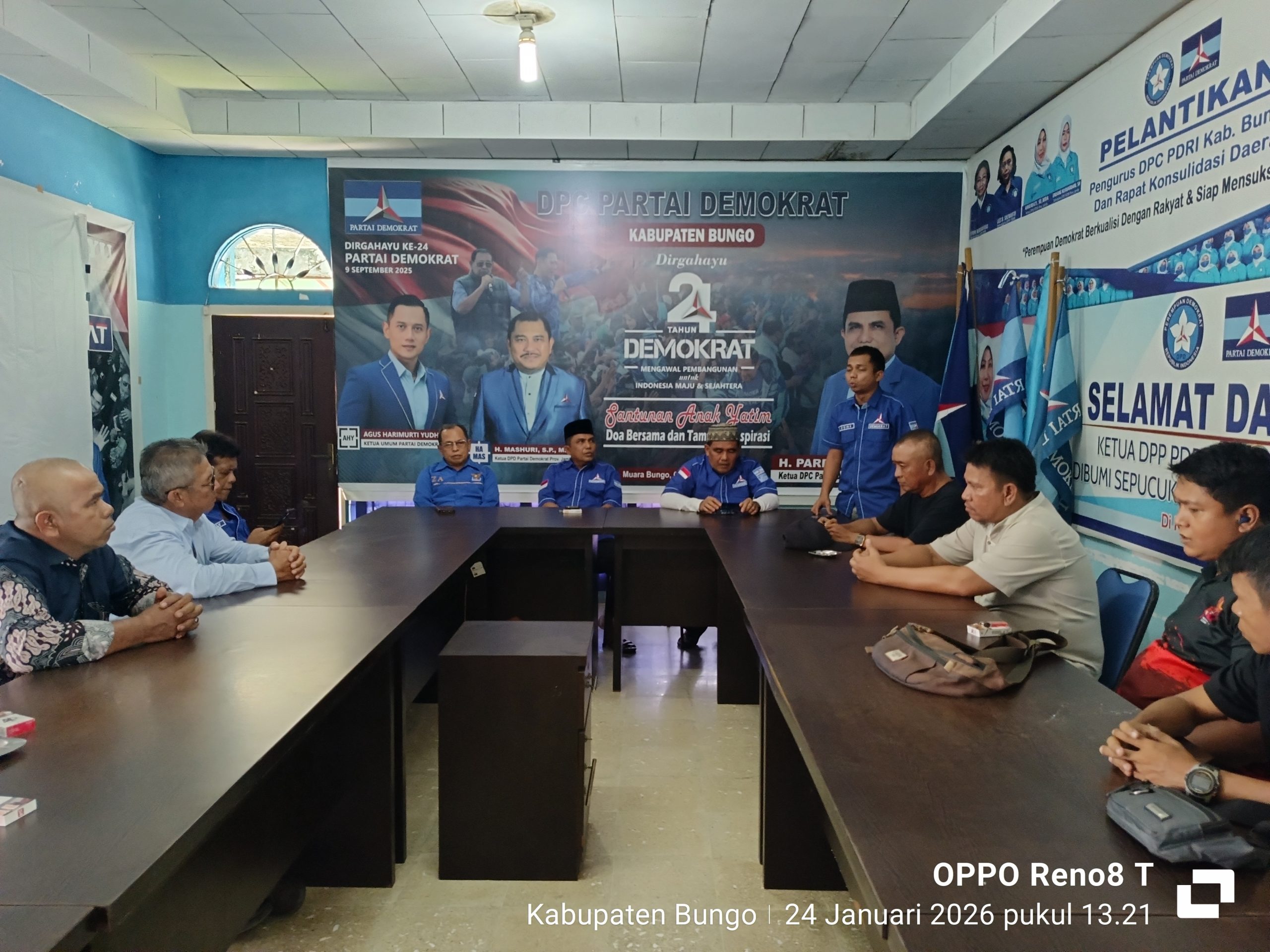 FAKTA BUNGO – Tim Anggota DPR RI Drs. H.Zulfikar Ahmad, Perwakilan Komisi VIII, melakukan kunjungan bersama tim ke DPC Demokrat Bungo dalam rangka memperkuat sinergi dan konsolidasi internal Partai Demokrat. , Sabtu siang (24/01/2026).