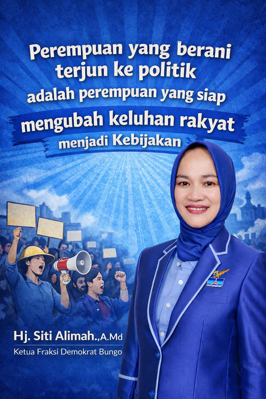 Sebagai Ketua Fraksi Demokrat Bungo, Hj. Siti Alimah berkomitmen untuk terus memperjuangkan berbagai aspirasi masyarakat, mulai dari persoalan ekonomi, pendidikan, hingga kesejahteraan sosial.