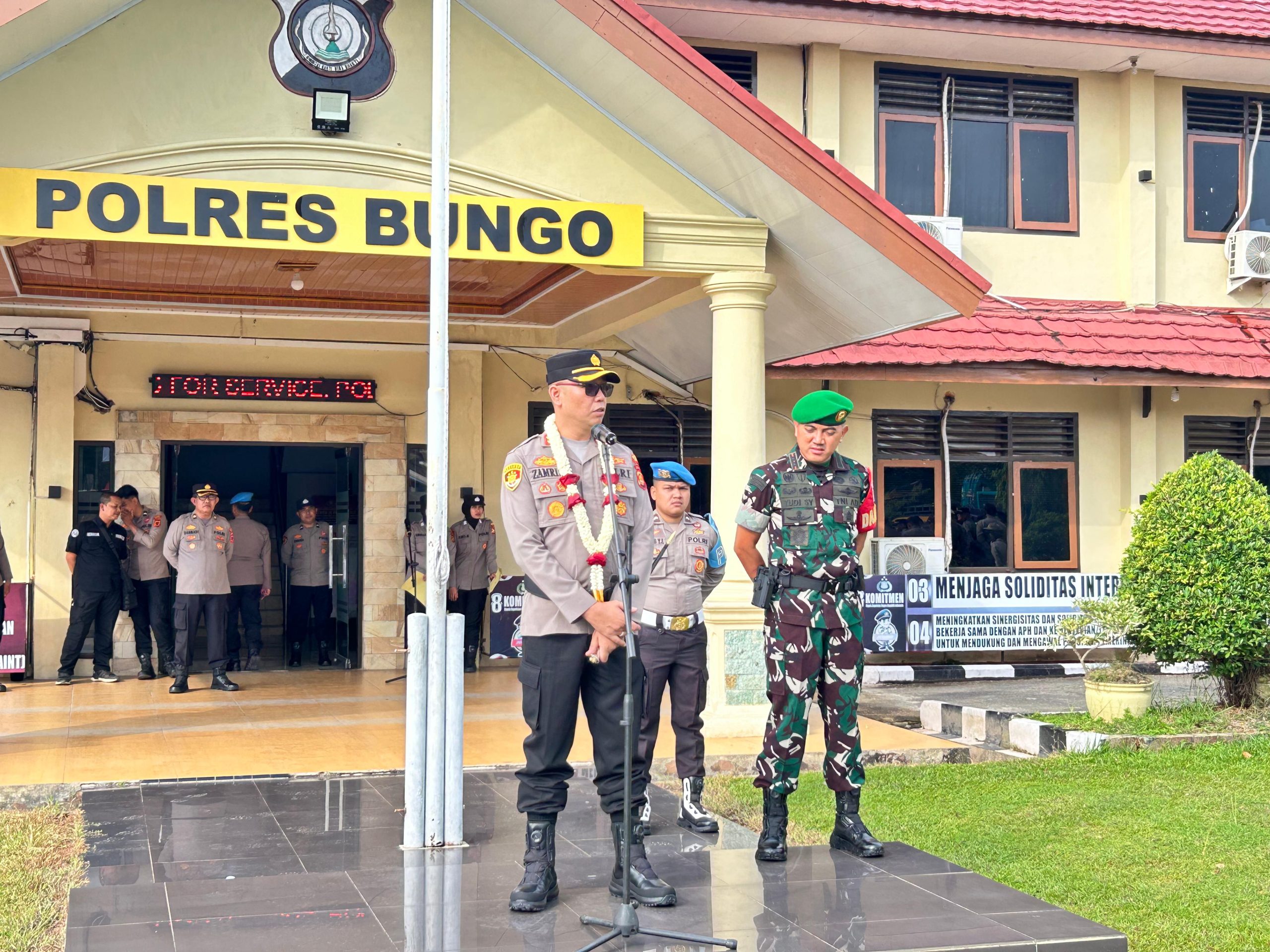 Setelah prosesi penyambutan, kegiatan dilanjutkan dengan apel bersama seluruh jajaran Polres Bungo.