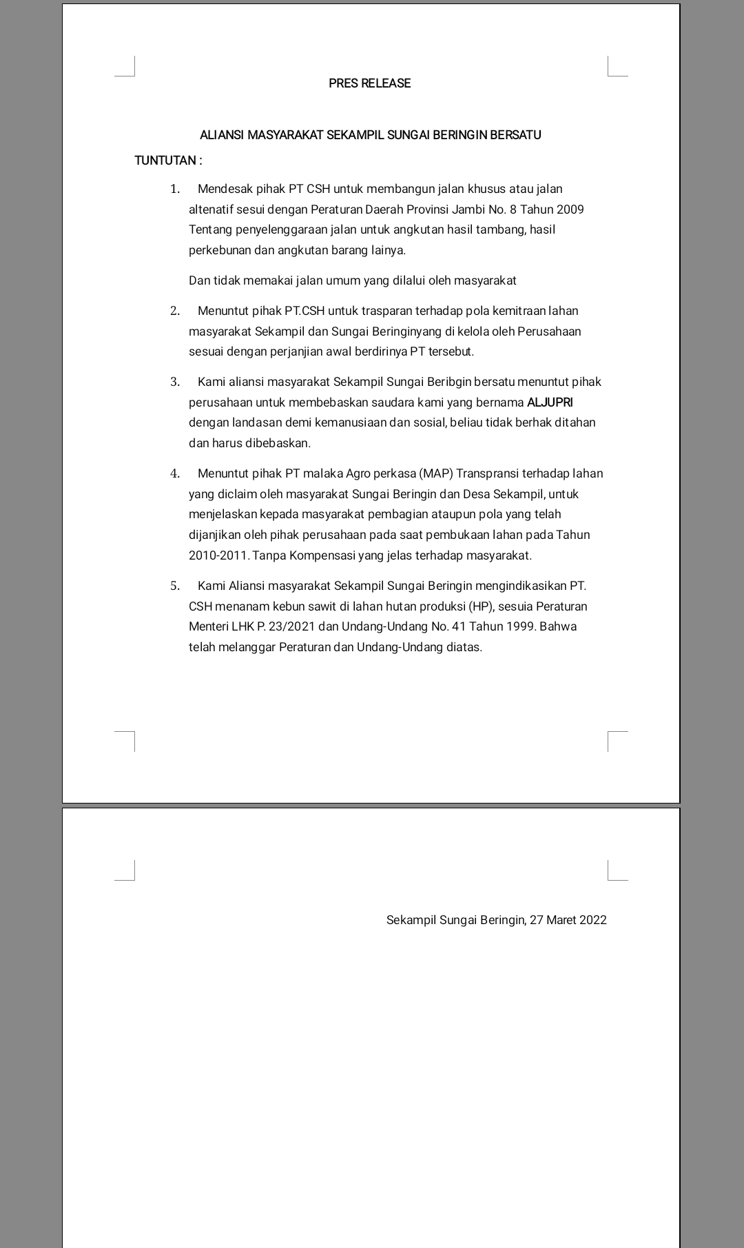 FAKTA BUNGO – Aksi pemortalan jalan operasional milik PT Citra Sawit Harum (CSH) terjadi di Desa ..Baca Selengkapnya…
